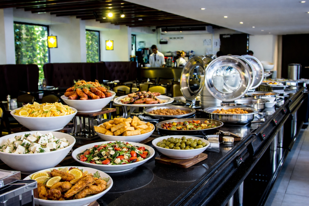 - Завтрак, обед и ужин в формате «шведский стол» с возможностью выбора. Промежуточные приемы пищи и выбор напитков в барах, расположенных на территории отеля. Приемы пищи могут предоставляться в конкретные промежутки времени (например, завтрак только с 10:00 до 11:00 и т.д.).