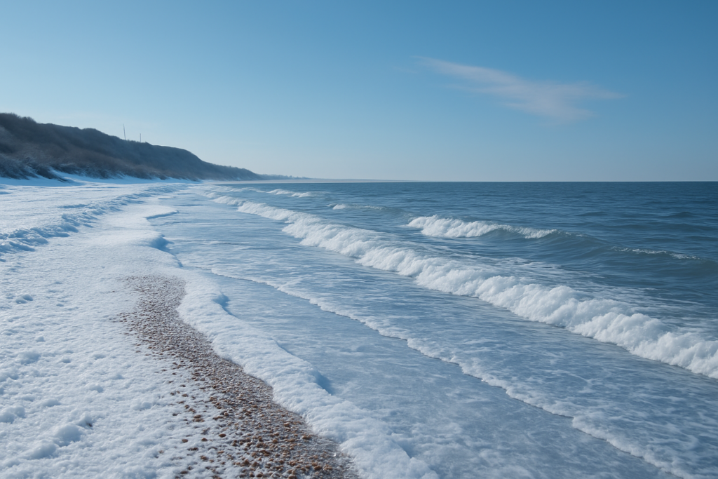 - В некоторых местах вода зимой застывает. Морские льдины представляют собой поистине впечатляющее зрелище, на которое стоит полюбоваться каждому.